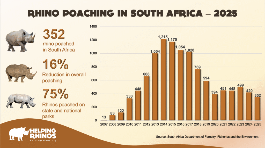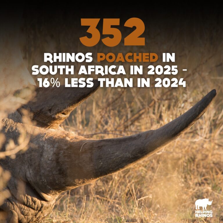 South Africa’s new Minister of Forestry, Fisheries and the Environment Mr. Willie Aucamp has announced that 352 rhinos were poached in South Africa in 2025. This is 68 less than were lost in 2024 and represents a 16% decrease.