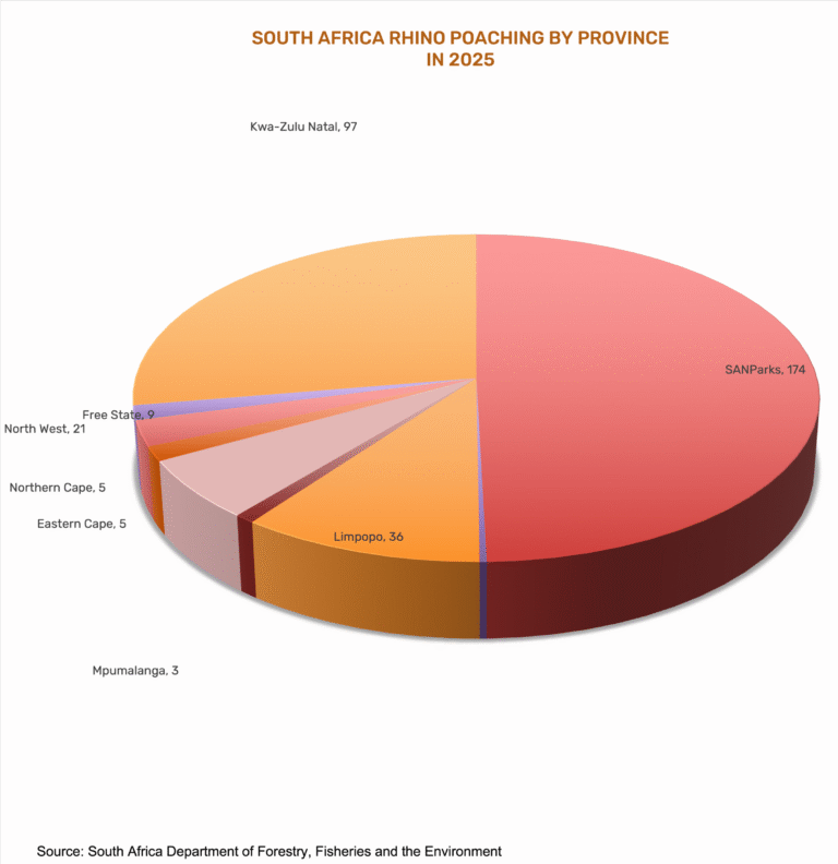 Again, private rhino custodians went above and beyond to hold the line, with just 25% of poaching happening on privately owned land, as opposed to the 75% seen in State and National Parks. Much of this was due to a concerning uptick in poaching within the world-famous Kruger National Park. In 2024 just 88 rhinos were lost, and hopes were high that ongoing anti-corruption efforts were yielding results for the imperilled park. However, the numbers for 2025 show that 175 rhinos were killed by poachers within the park’s boarders, accounting for almost 50% of all rhinos lost.